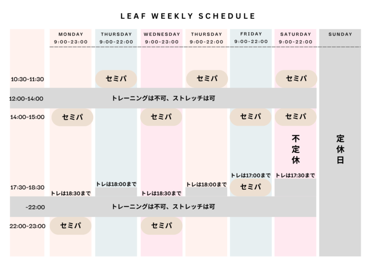 一階の飲食店との兼ね合いやストレッチの予約状況次第ですが、21:30ごろから始められることもあるかもしれません。(当日の19:00ごろにならないとわかりませんが💦)